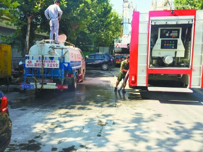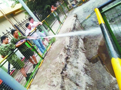 在管道內淤泥疏松后,需大量的水對管道內進行沖洗,為保證用水,市消防局安排了一輛消防車專門支持管道沖洗。據悉,消防車一次能提供15立方米的水,可以使用半小時。但工地附近無消防栓,每次加水均要回到消防隊,導致施工難度大、功效低。