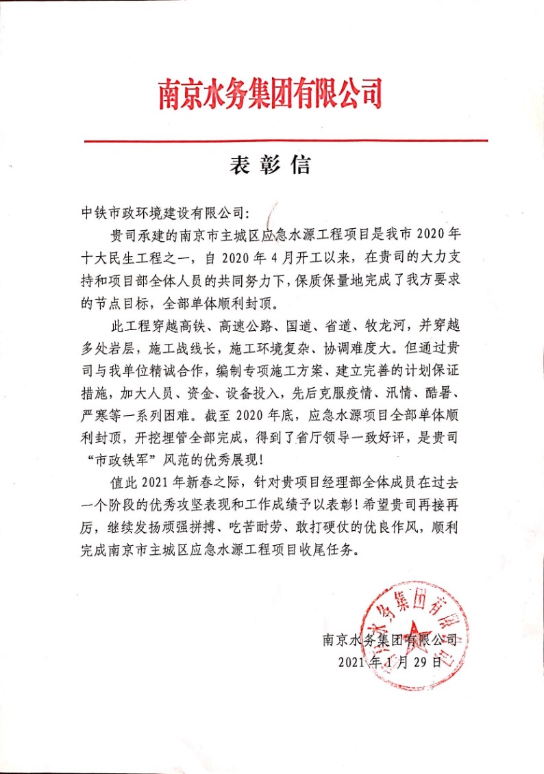 自2020年4月開工以來,南京市主城區(qū)應(yīng)急水源工程項(xiàng)目保質(zhì)保量完成節(jié)點(diǎn)目標(biāo),全部單體順利封頂,開挖埋管全部完成。該工程施工戰(zhàn)線長,施工環(huán)境復(fù)雜、協(xié)調(diào)難度大,項(xiàng)目部精心編制專項(xiàng)施工方案、建立完善的計(jì)劃保證措施,從人員、資金、設(shè)備等角度加大投入力度,保證施工進(jìn)度。該工程在為當(dāng)?shù)孛裆聵I(yè)發(fā)展送去便利的同時(shí),也良好地展現(xiàn)了“市政鐵軍”頑強(qiáng)拼搏、吃苦耐勞的精神面貌。為此,南京水務(wù)集團(tuán)有限公司發(fā)來表彰信。