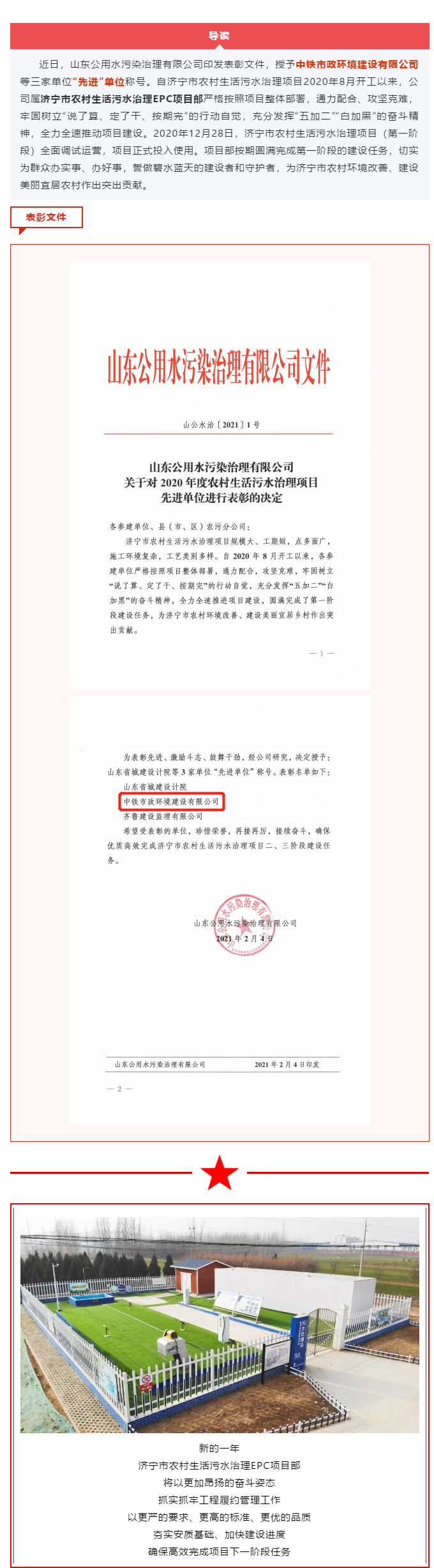 濟(jì)寧市農(nóng)村生活污水治理EPC項(xiàng)目部再添新譽(yù)